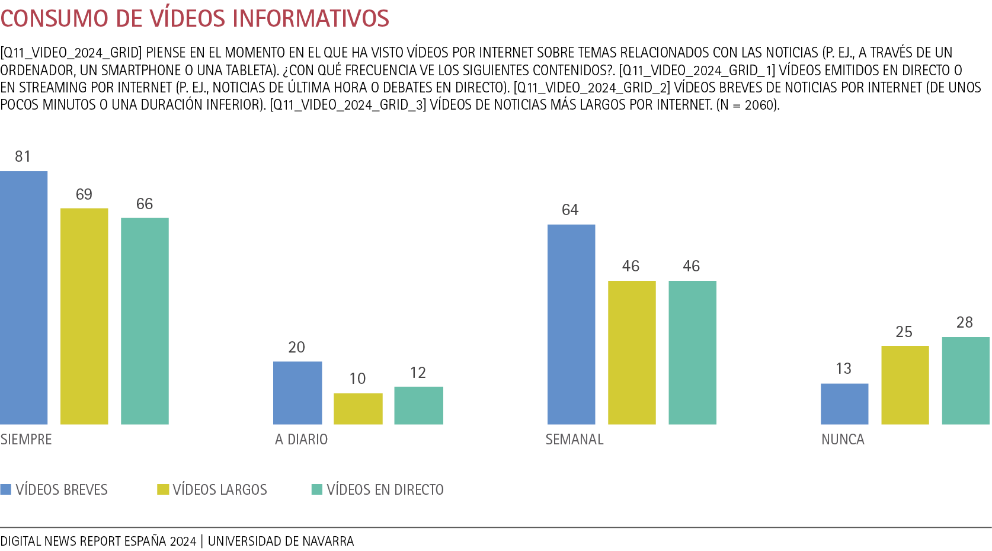 En el informe del año 2023, el 71% de los adultos españoles conectados a Internet vieron vídeos de noticias en la última semana. Los datos revelaron que España es el país del sur y el oeste de Europa en el que más personas consumen vídeo informativo. En el informe del año 2024 se ha consultado la frecuencia con que la audiencia consume vídeos por Internet sobre temas relacionados con las noticias (por ejemplo a través de ordenador, smartphone o tableta) en tres tipologías: vídeos en directo, vídeos cortos (de unos minutos o menos) o vídeos largos. La adaptación de los contenidos periodísticos a las distintas plataformas (YouTube, TikTok, Instagram, etc.) permite conectar con audiencias que demandan concisión y comunicación directa.