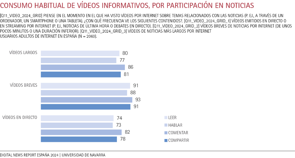 Una vez expuesta la relación entre el uso recurrente de vídeos y el interés de la audiencia, es pertinente analizar cómo es la interacción de los usuarios de vídeo con las noticias. Las acciones más habituales incluyen la lectura de contenidos noticiosos, el diálogo sobre los hechos de actualidad, el intercambio de información y la difusión de material multimedia a través de redes sociales. Una vez más, los vídeos cortos son los que generan más atención. Su facilidad de acceso y escasa duración (en ocasiones menos de un minuto) intensifica la capacidad de la audiencia para difundirlos, leer comentarios en los medios o plataformas de publicación (91%), hablar sobre los acontecimientos actuales (88%), comentar (93%) y compartir (91%) la información.
