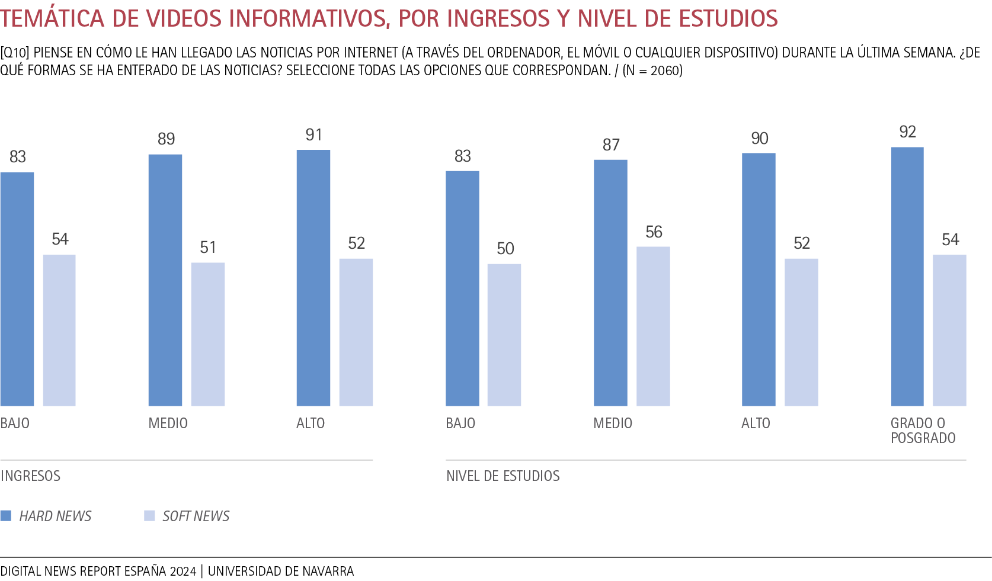 En el análisis de las variables sociodemográficas, podemos observar que a medida que aumenta el nivel educativo y de ingresos de los encuestados, aumenta la selección de temas relevantes o hard news. El 91% de las personas con mayor nivel de ingresos incluye vídeos sobre temas relevantes, al igual que las personas que han cursado un grado o posgrado (92%). En el caso de la distribución de soft news apreciamos equilibrio en el nivel educativo y de ingresos. En general, hay una distribución homogénea que supera el 50% en cada caso.