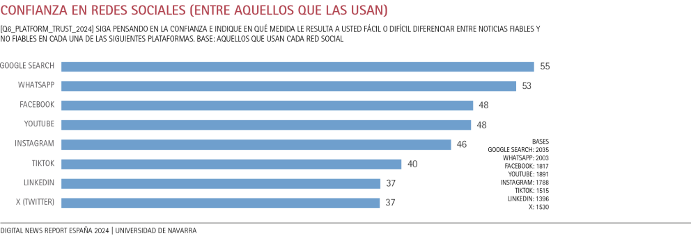 Google Search y WhatsApp son percibidas como las redes más confiables por el público general (55% y 53%, respectivamente). Sin embargo, entre los menores de 24 años, Instagram, WhatsApp y YouTube destacan como las redes más fiables. Por otro lado, para la población más adulta, Google Search, WhatsApp y Facebook son consideradas las más creíbles, mientras que TikTok es vista con mayor escepticismo, siendo la menos confiable para este grupo (28%).