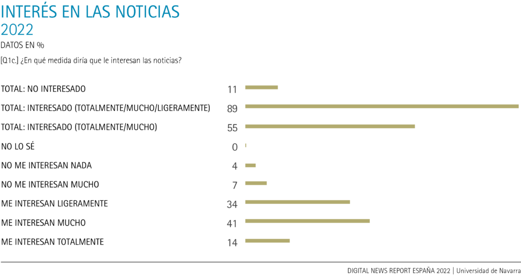 Si bien no son sinónimos, el interés de los ciudadanos en las noticias y su confianza en ellas son dos valores entrelazos de algún modo. Por un lado, el interés es la inclinación positiva del público para comprender su entorno más y menos próximo; le entronca con su tiempo social, político y cultural, y le ayuda a decidir y sobrellevar la incertidumbre. Por otro lado, la confianza es la esperanza firme que ayuda a satisfacer un interés. En el caso de la información y las noticias, se trata de un valor crucial. Por ello, los datos del Digital News Report España 2022 son también preocupantes. Al aumento de la desconfianza en las noticias se suma el desinterés ciudadano en ellas. En los últimos ocho años, el porcentaje de españoles muy interesados (‘totalmente/mucho’) en la información ha caído del 85% en 2015 al 55% en 2022. Asimismo, el porcentaje de desinteresados en las noticias se ha multiplicado por diez a lo largo de este período de tiempo: del 1% al 11%. Tal y como el capítulo anterior refleja, para las personas que carecen de interés en las noticias (por hartazgo, por fatiga, por motivos emocionales, etc.), su confianza en ellas es irrelevante. Y al revés, aquellos que no se fían de las noticias tienden a desinteresarse por ellas. De este modo, la ciudadanía puede entrar en una espiral viciosa de desconfianza y desinterés informativo.