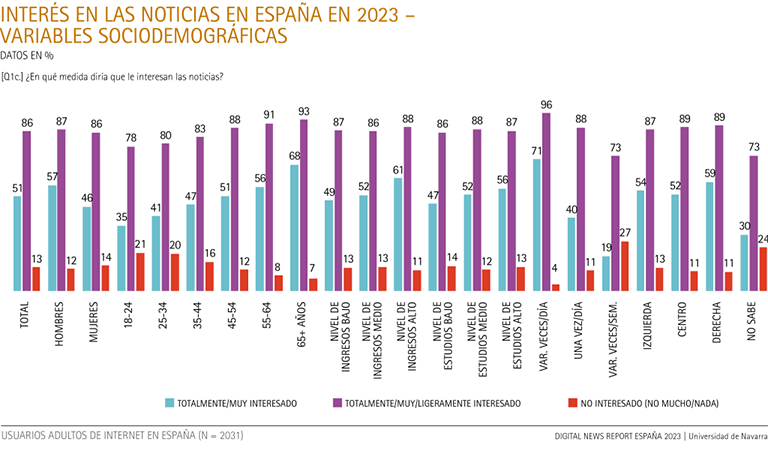 Sobre la inclinación política, vuelve a percibirse que cuanto más definida es el público tiene un interés informativo mayor. Seis de cada diez encuestados que se ubican en la derecha (59%) y cinco de cada diez que se sitúan en la izquierda (54%) y en el centro (52%) garantizan estar totalmente o muy interesados en las noticias. En cambio, solo tres de cada diez de quienes no saben posicionarse políticamente reflejan este grado de interés (30%). Además, a dos de cada diez internautas que no saben identificarse políticamente no les atraen las noticias (24%). Se trata de 11 puntos porcentuales sobre la media general. De todos modos, al precisar el grado de totalmente, mucho o ligeramente interesado, no se ven diferencias notables. En cambio, siete de cada diez usuarios que no saben reconocerse políticamente exponen este nivel de interés (73%). Algo similar al año pasado.
