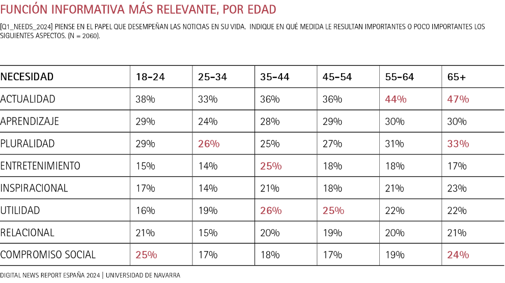 No obstante, existen diferencias por edad en algunas de las funciones o necesidades o gratificaciones. En general, los grupos más adultos valoran más todas las necesidades esperadas que las cohortes más jóvenes. Así, mientras el 80% de los mayores de 55 años espera noticias que les mantengan al día de lo que acontece, ese porcentaje se reduce por debajo del 70% en el caso de los menores de 44 años. En el caso de aquellas noticias que ofrecen diversos puntos de vista, el 75% de los mayores de 45 años las valora frente al 62% de los menores de esa edad.