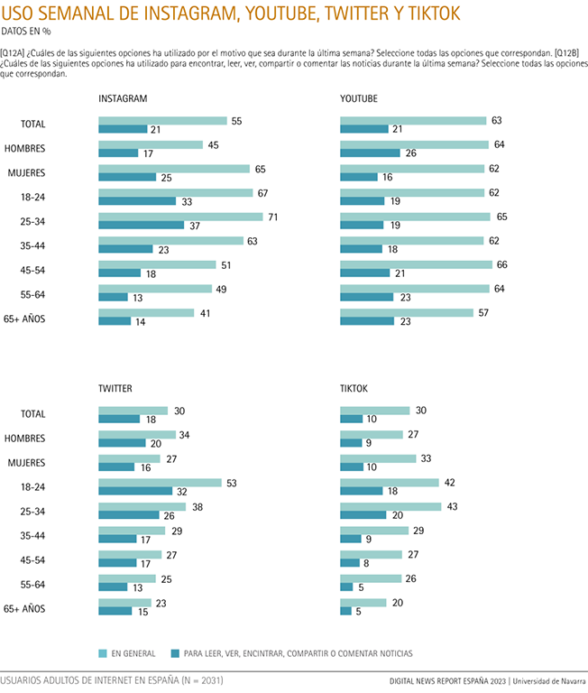 En el mercado español, de forma opuesta a Twitter y más similar a Instagram, usan TikTok más las mujeres (33%) que los hombres (27%), si bien el uso informativo se equilibra, con un 10% y un 9%, respectivamente. Aunque se va extendiendo el uso general de la plataforma de vídeos verticales de Bytedance entre las distintas franjas de edad, el perfil de uso para ver, comentar y compartir noticias es más joven. Así, cerca de la mitad de los usuarios de TikTok en España entre 18 y 24 años (42%) y entre 25 y 34 años (43%) dan un uso informativo a esta plataforma (18% y 20%, respectivamente), pero en las franjas de edad de 35 a 44 años (29%) y de 45 a 54 años (27%) la proporción de uso informativo se reduce a algo menos de una tercera parte (9% y 8%); este uso en relación con noticias, en las franja de 55 a 64 (26%), se queda en una quinta parte (5%), y supone una cuarta parte (5%) a partir de 65 años (20%), al mantenerse la función informativa pero reducirse el uso general.