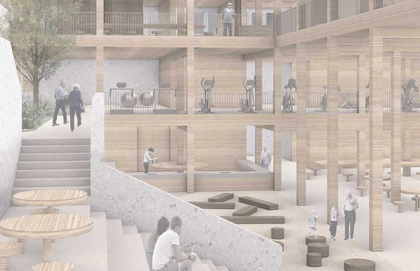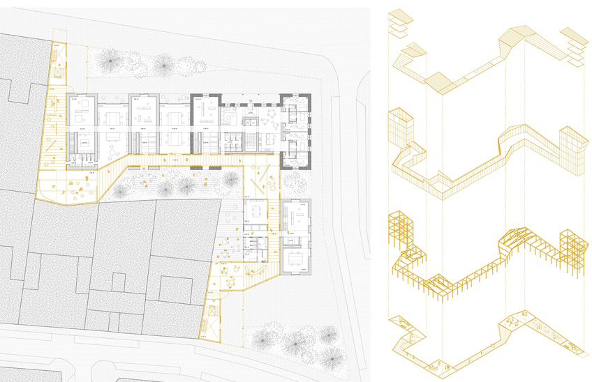 La propuesta de Carlos Jiménez Aldaba se caracteriza por una vocación social que busca paliar el aislamiento de las personas mayores y las dificultades de los jóvenes para emanciparse a través de una residencia intergeneracional. Su propuesta busca “llevar la calle, la vegetación y la vida social al interior del edificio” y propone.