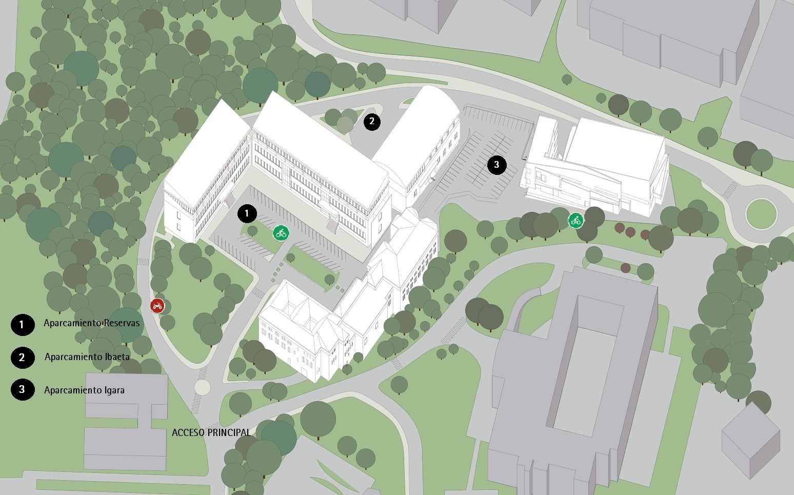La Universidad de Navarra pone a disposición de alumnos y empleados zonas de depósito de bicicletas en las proximidades de todos los edificios. Por este motivo, se agradece que no se utilicen otros elementos del mobiliario urbano (farolas, señales, árboles).