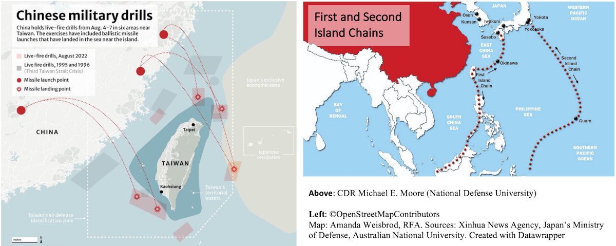 For many decades, the PRC has regarded Taiwan as a legitimate possession, trying to gain control over it and repeatedly using it as a pretext to extend its domain along the South China Sea. The government of Xi Jinping, who sees such environment as Chinese territorial waters, has been undertaking a serious modernization of its naval capabilities and technologies in recent years, transforming the navy of mostly coastal patrol forces into a dominant fleet. Additionally, China appears to have learned the concept of “island chains”, coined by John Dulles in the 1950’s. Applied against the USSR during the Cold War as part of the US containment policy, the island chains consist in imaginary lines drawn in the map by building military outposts in some of the islands of the South China Sea and the Philippine Sea; being then able to project power and restrict any unwanted access.