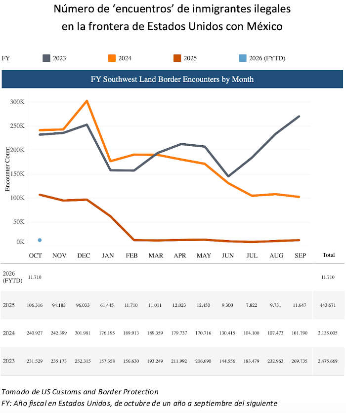 La alarma ante esta situación ha cortado en seco el flujo de nuevos migrantes ilegales hacia EEUU. Comparando los datos de ‘encuentros’ de los primeros nueve meses del segundo mandato de Trump con los datos del expresidente Biden en ese mismo espacio de tiempo en 2021, se ve un gran cambio migratorio. Mientras que en el arranque del gobierno de Biden se registraron 643.590 ‘encuentros’ bajo el Título 8 de la Ley de Inmigración (enero-septiembre de 2021), en el de Trump tan solo tuvieron lugar 147.139 (enero-septiembre de 2025). Es decir, considerando el mismo periodo y contexto de ambos, se ha producido una caída en la cantidad de ‘encuentros’ en la frontera suroeste del 77,13%. Esto parece indicar que las agresivas políticas y la retórica anti migratoria de la nueva Administración están logrando su propósito de disuadir a la población migrante de intentar entrar al país.