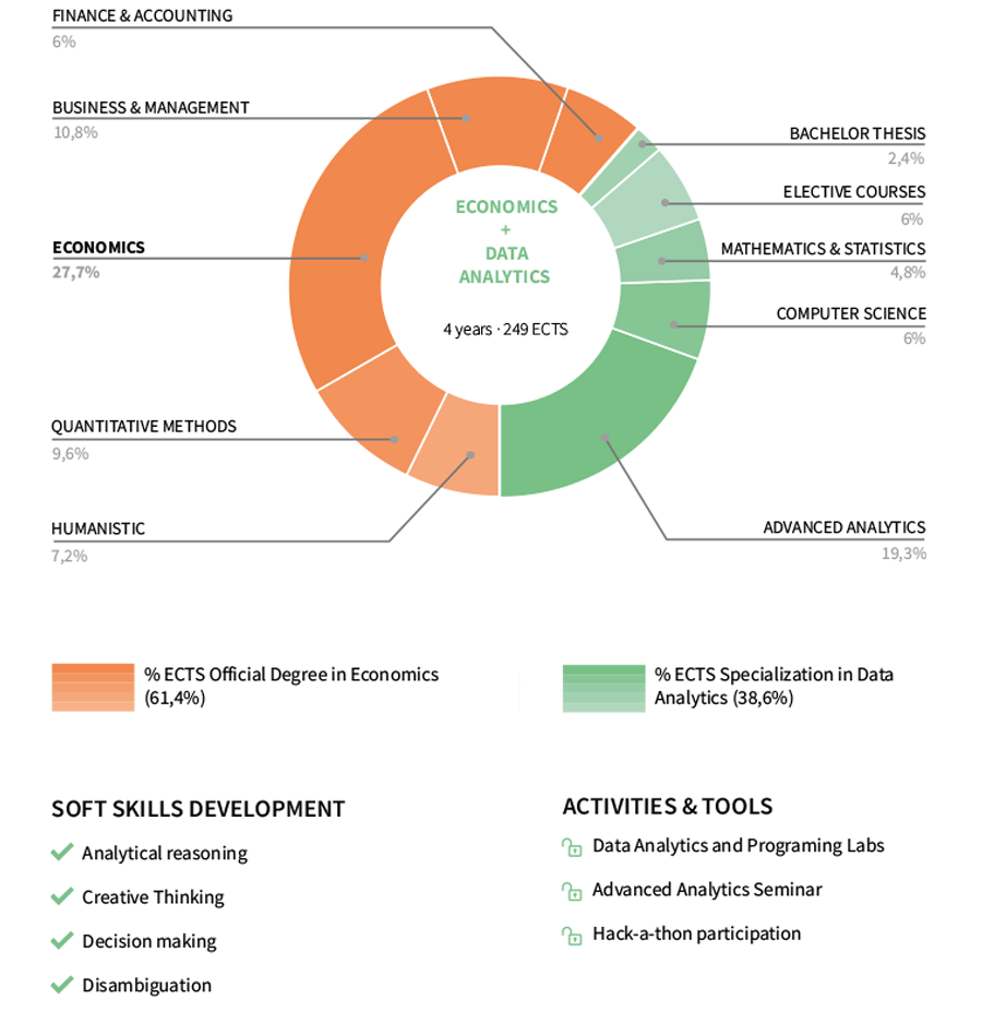 Graduates have knowledge of quantitative analysis and prediction models and advanced technological tools. In addition, they should have a profound understanding of today’s economic and business world, whether they have studied Economics or Business Administration. Through this double training program, students will become professionals who are capable of identifying problems and offering technological solutions.