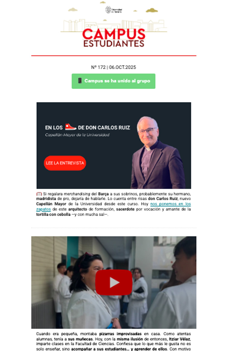 El boletín semanal de los estudiantes de la Universidad de Navarra. Cuenta la vida universitaria en estado puro, historias de alumnos, de dónde venimos, a dónde vamos, avisos importantes... ¡Todos los lunes en tu correo!