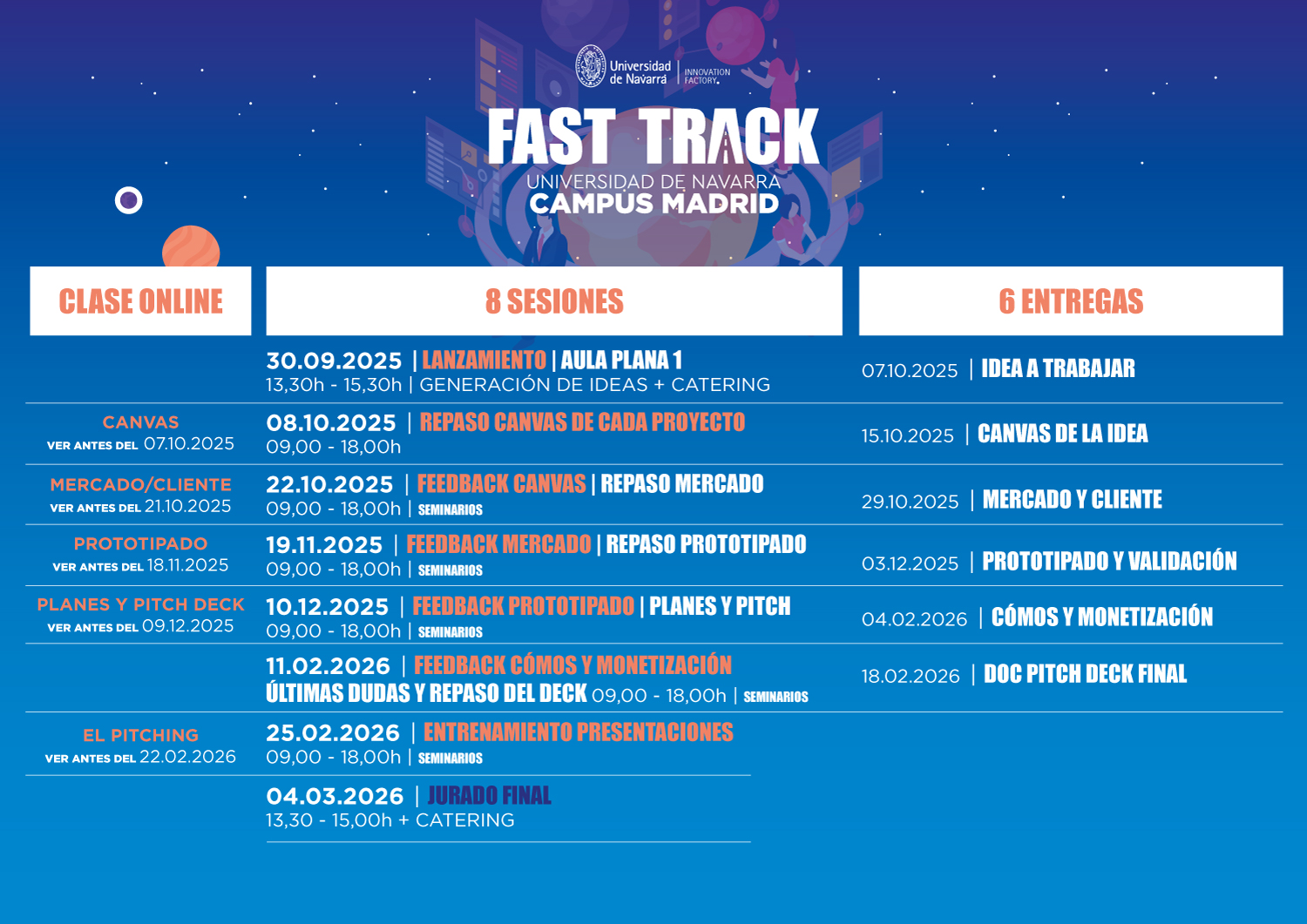 El Fast Track Madrid es el programa - competición de emprendimiento de la Universidad de Navarra diseñado para complementar, acompañar y enriquecer la formación de tu máster. Aprenderás a convertir cualquier idea en un plan de negocio real y accionable y trabajarás con estudiantes de todos los másteres de Madrid. ¿Piensas en montar un nuevo despacho? ¿En crear tu propia empresa? ¿En aportar una nueva línea de negocio a la empresa en la que empieces a trabajar? No lo pienses más y pon la primera piedra: durante el recorrido del Fast track asistirás a sesiones teórico-prácticas para aprender todo lo que necesitas saber para poner en marcha un proyecto de emprendimiento o de innovación .