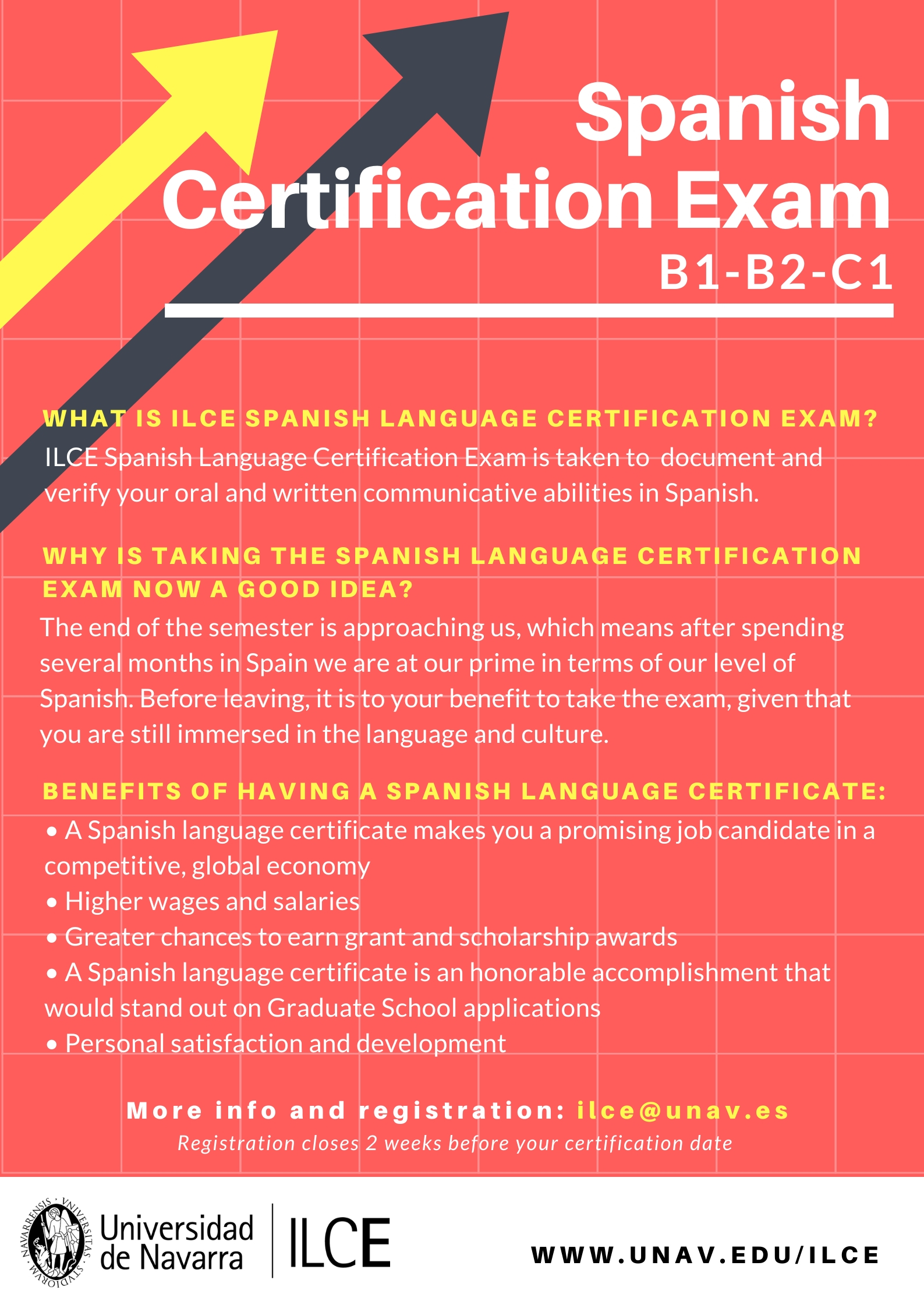 El examen de Certificación de Español Universidad de Navarra-ILCE es un título acreditativo del grado de competencia del idioma español que otorga el Instituto de Lengua y Cultura Españolas (ILCE) de la Universidad de Navarra de acuerdo con lo establecido por el Ministerio de Educación y Formación Profesional de España según el RD 1/2019 de 12 de enero. Se puede realizar online o presencial y en los niveles B1, B2 y C1.