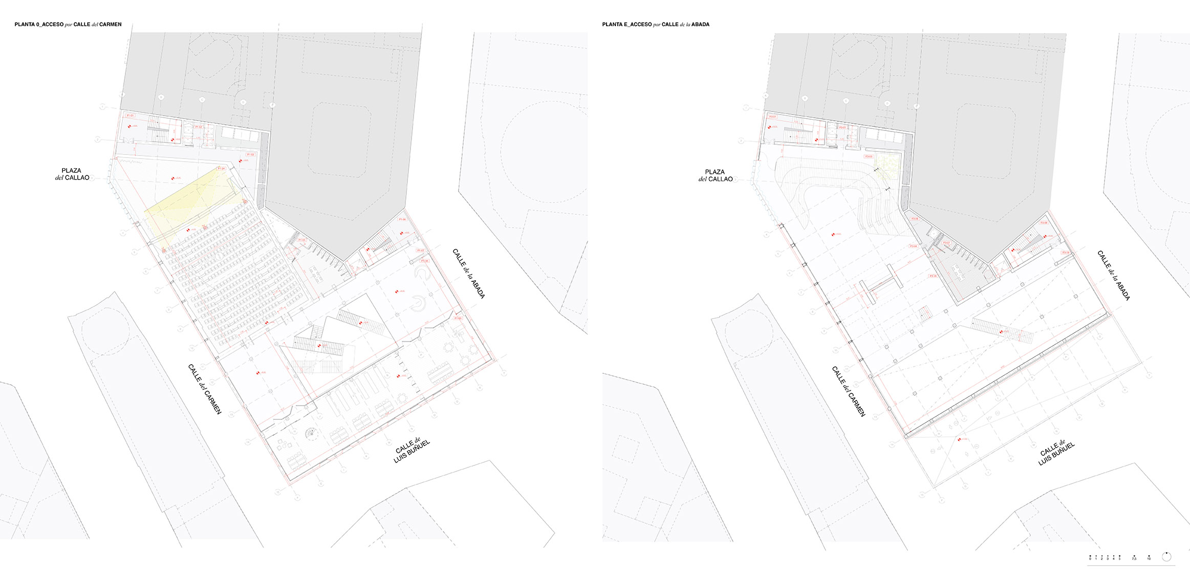 Se aprovecha el cambio de cota para generar dos accesos jerarquizados: la planta principal, en contacto con Callao, y la entreplanta, como acceso independiente por la Calle de la Abada.