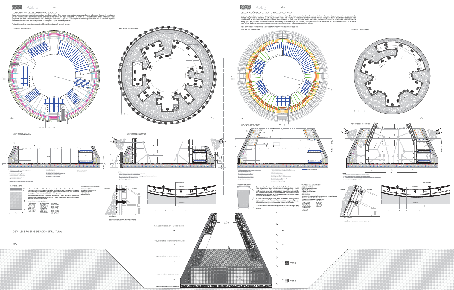 En cuanto al sistema estructural se propuso un sistema de 5 fase con un encofrado a una cara, compuesto por tableros de madera fenólicos reciclados, rectos y curvos, que, disponiéndolos a acorde a las cavidades necesarias por fase, se iba creando un lienzo sobre el que el hormigón gunitado y el aislamiento térmico se proyectasen. Las fases que se visualizan son la 2 y la 3, aquellas que fueron claves para el desarrollo completo.