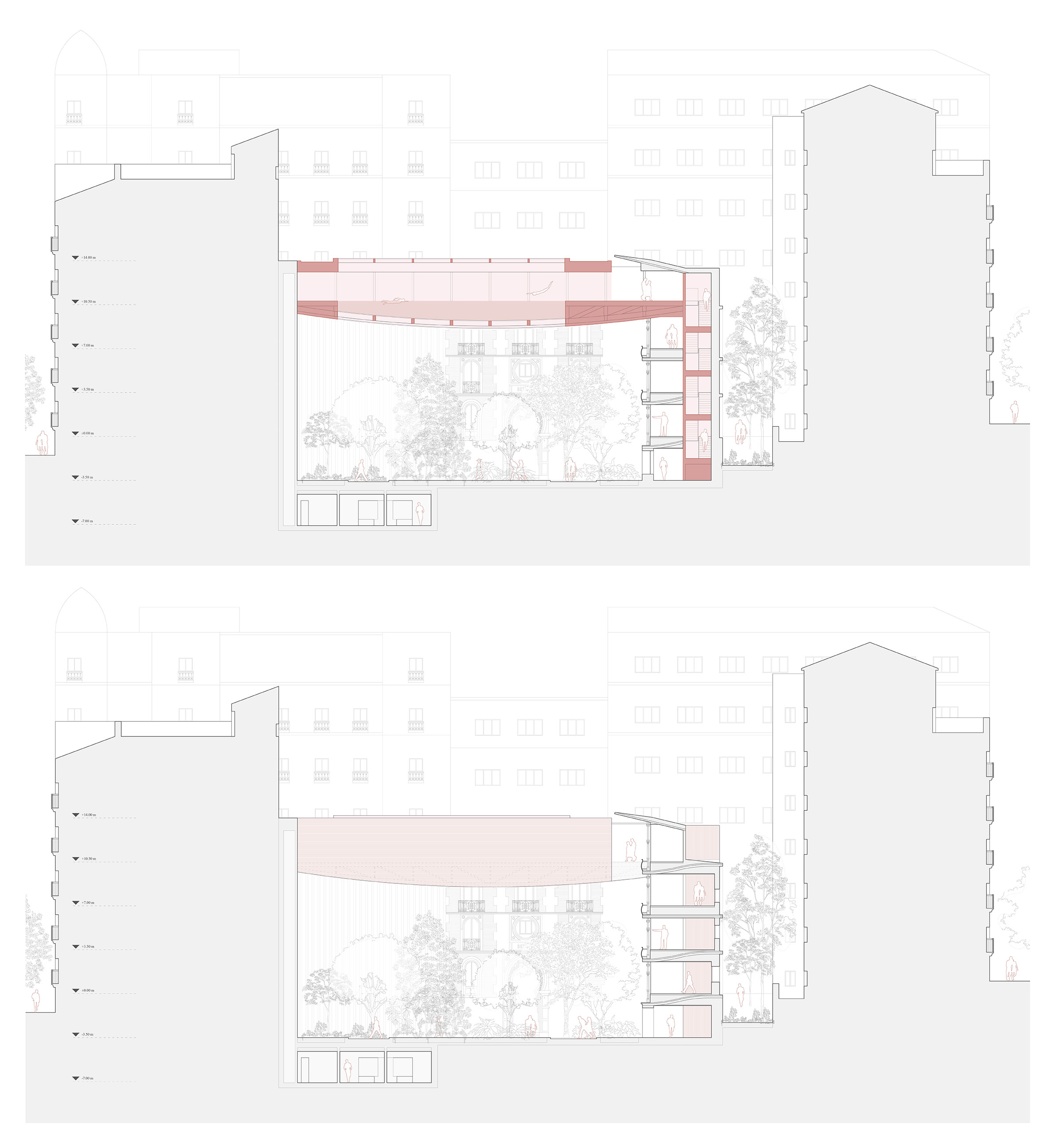 De esta manera, se mantiene la mayor parte de la edificación de valor histórico existente, se devuelve el frontón a la ciudad generando un jardín público accesible en su interior y se incorporan dos volúmenes escultóricos sobre el jardín, los cuales albergan los usos principales de la rehabilitación y terminan conformando el conjunto del espacio interior del Beti-Jai.