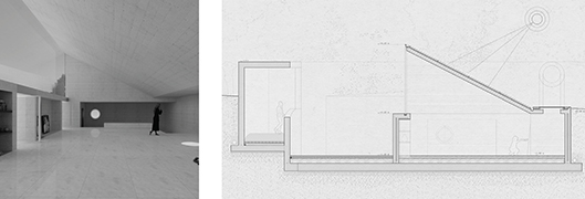 El estudio de pintura queda cubierto por un plano de hormigón inclinado 30º, revestido al completo por paneles fotovoltaicos, que sirven energéticamente a todo el complejo. Se crea así un gran ventanal a norte, dejando pasar la luz óptima para el trabajo.