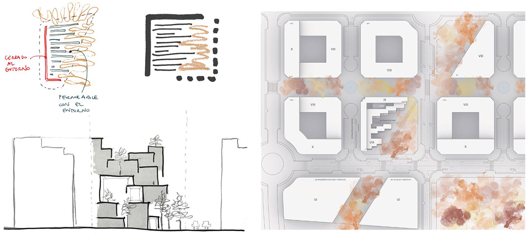 Además, una gran diagonal verde cruza la parcela y a esto se le da gran importancia, buscando que el proyecto sea uno de los núcleos verdes del barrio. Además, apuesta por ser dinámico y cambiante frente a sus alrededores macizos. Se van tomando decisiones tanto urbanísticas y formales, como climáticas, de cerrarse a las orientaciones norte y oeste y ser permeable a la sur y la este.