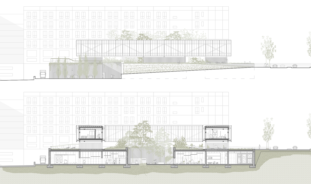 El objetivo es generar un espacio público protegido mediante la formación de montículos que alberguen tanto usos públicos (orientados hacia la plaza), como privados (situados al otro lado de la franja).