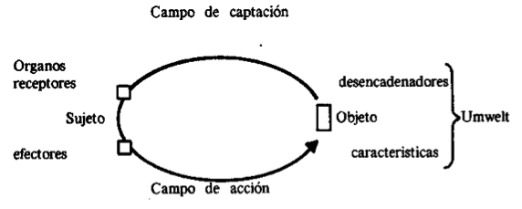 Con estas perspectivas, Uexküll propone el famoso esquema del círculo funcional ("Funktionkreis") de las vivencias animales4. La unidad estructural del "Umwelt", perimundo o ambiente, se distiende en dos campos: el campo de captación y el campo de acción. El primero engloba el sistema de características captables por el organismo y el propio sistema de captación; el segundo, el sistema de acciones del animal y su medio en cuanto afectado por estas acciones.