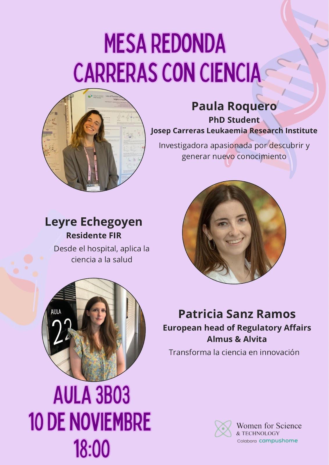 "Mesa redonda: carreras con ciencia". Paula Roquero, PhD student Josep Carreras Leukaemia Research Institute; Leyre Echegoyen, residente FIR; y Patricia Sanz Ramos, European Head of Regulatory Affairs Almus & Alvita.
